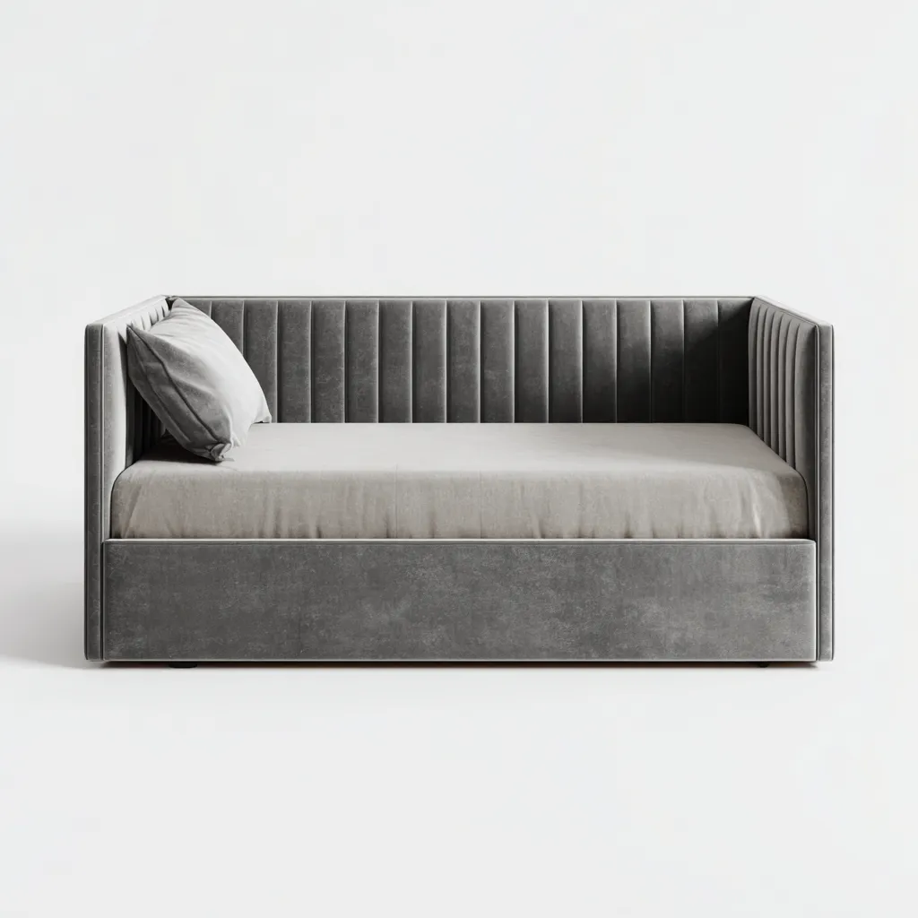 Divano letto dal profilo essenziale progettato per ambienti domestici come soggiorni e camere per ospiti. La struttura compatta consente un utilizzo funzionale come seduta quotidiana e come soluzione per il riposo.